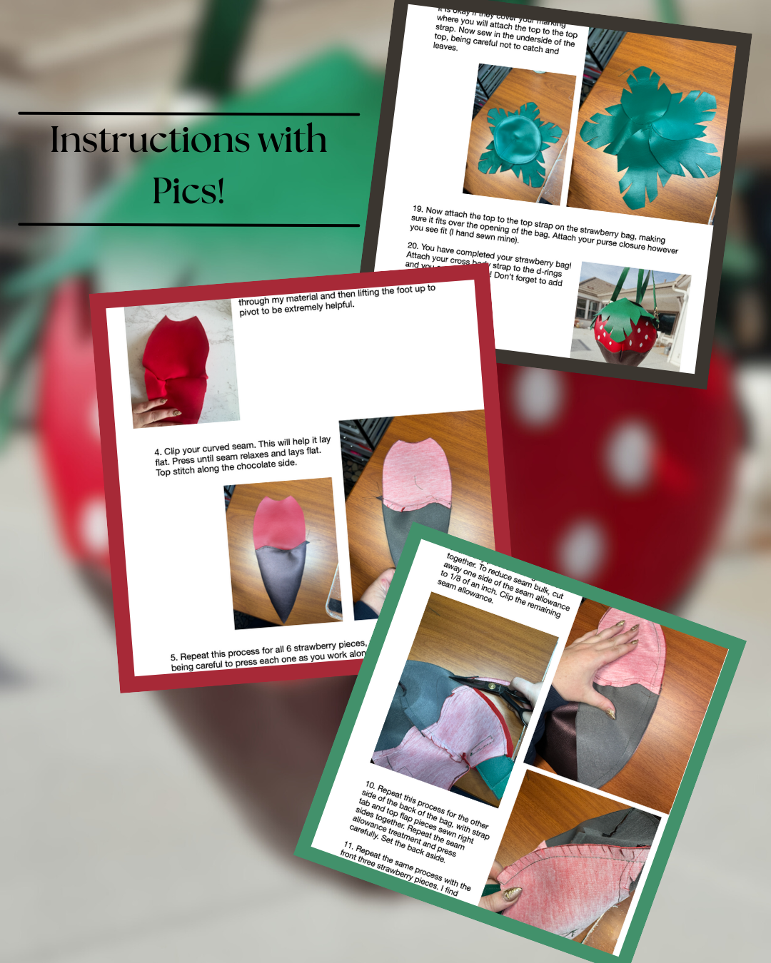 The Chocolate covered strawberry purse PDF sewing pattern is a fun novelty purse pattern for advanced sewists and purse makers. It features steep curves and a fun, unique 3D shape.